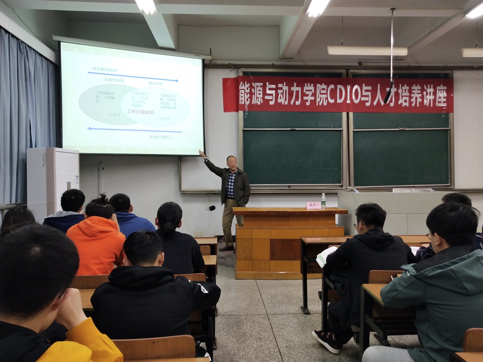 姚寿广教授就CDIO与人才培养的国内外形势展开讲解。在讲座中老师结合当前国际形势分析了国内外工程教育现状及存在的问题。向同学们详细地讲解了工程技术对人才培养的综合性要求,提出了企业HR人才招聘衡量的三个核心能力要素。姚教授还为同学们讲述了从经验到知识,从知识到能力的培养过程。清晰的阐述了国内教育问题的症结和获得过程性知识与关键能力的方法。最后点明了CDIO的意义、内涵、教育理念、核心及其四、六要素表述。