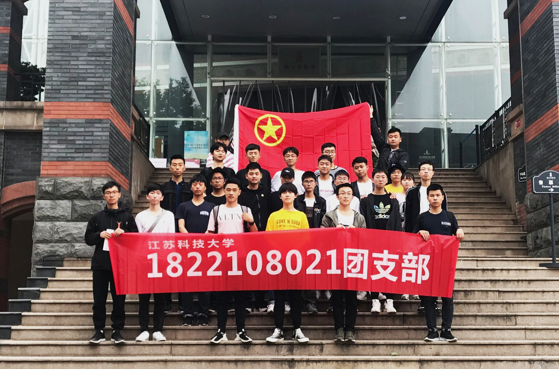 活动开始前,在团支书张文哲同学的带领下,同学们佩戴团徽,在镇江博物馆外面对团旗,齐唱团歌。