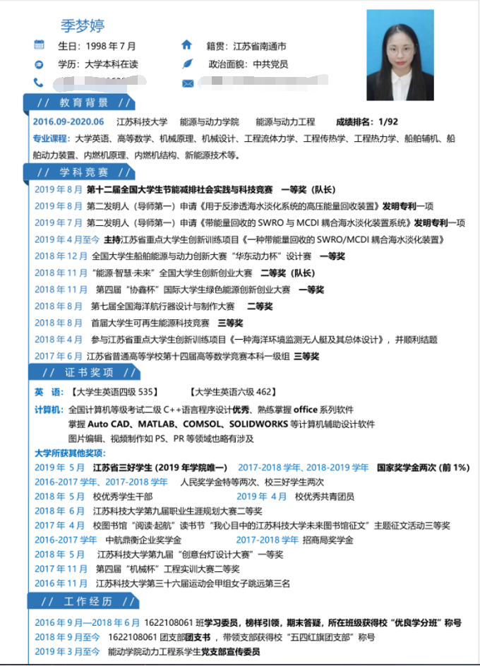 日前,共青团中央公布2019年度 “中国电信奖学金”获奖名单,2016级员工季梦婷荣获“中国电信奖学金•飞Young奖”。 据了解,“中国电信奖学金”评选活动始于2014年,由共青团中央、中国电信集团公司、全国学联联合设立。奖学金面向全国全日制非成人教育的各类高等院校在校专科生、本科生、硕士研究生和博士研究生(均不含在职研究生)开展评选。活动旨在遴选和推介一批优秀老员工典型,凝聚和引领当代老员工树立远大理想、热爱伟大祖国、担当时代责任、勇于砥砺奋斗、练就过硬本领、锤炼品德修为。本年度评选经过校级、省级、全国三级遴选推荐,通过网络投票、各级评委会评审和公示等环节,共评出“中国电信奖学金·天翼奖”50名、“中国电信奖学金·飞Young奖”1700名。获得“天翼奖”和“飞Young奖”的同学分别可获得奖金2万元和5000元。中国电信集团将为有意愿的获奖员工提供优先安排实习岗位或招聘录用等优惠条件。 青年当自强,季梦婷同学任团支部书记,多次获得校三好员工,同时获得江苏省三好员工荣誉,也获得国家奖学金的荣誉。从大一的懵懂误闯、跌跌撞撞,大二的但问耕耘,不问收获,再到大三的挑起大梁,直面挑战,最后到大四的保研成功,继续挑战,季梦婷同学用自身的行为,诠释了新时代老员工的深刻内涵,用自身行动为学弟学妹们树立了榜样。她表示,锁定一个目标,可以是超越自己,可以是超越他人,也可以是超越学长学姐的成绩!挑战不可能,你将成为可能!