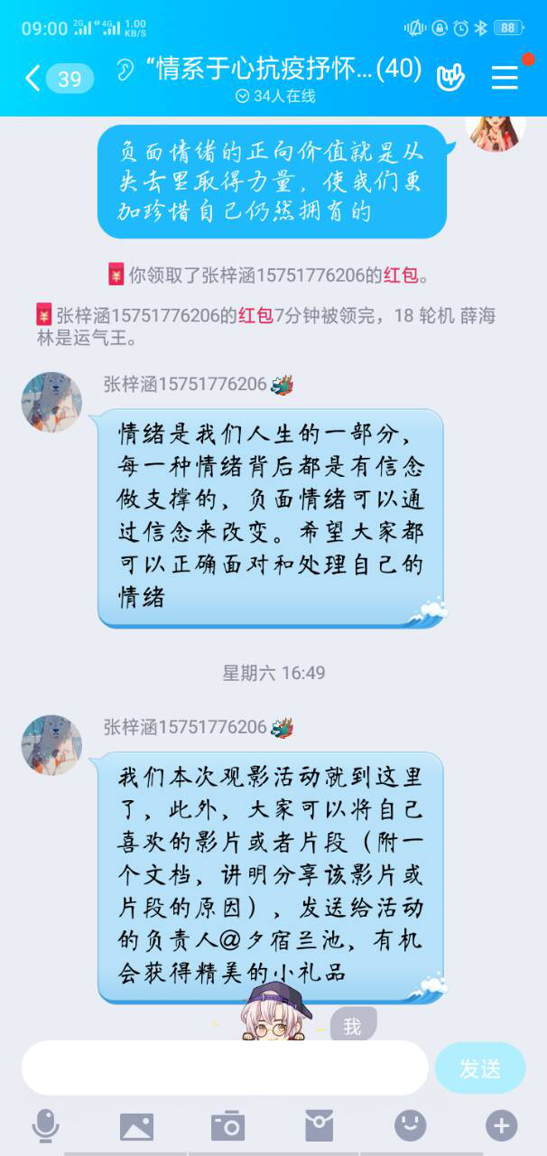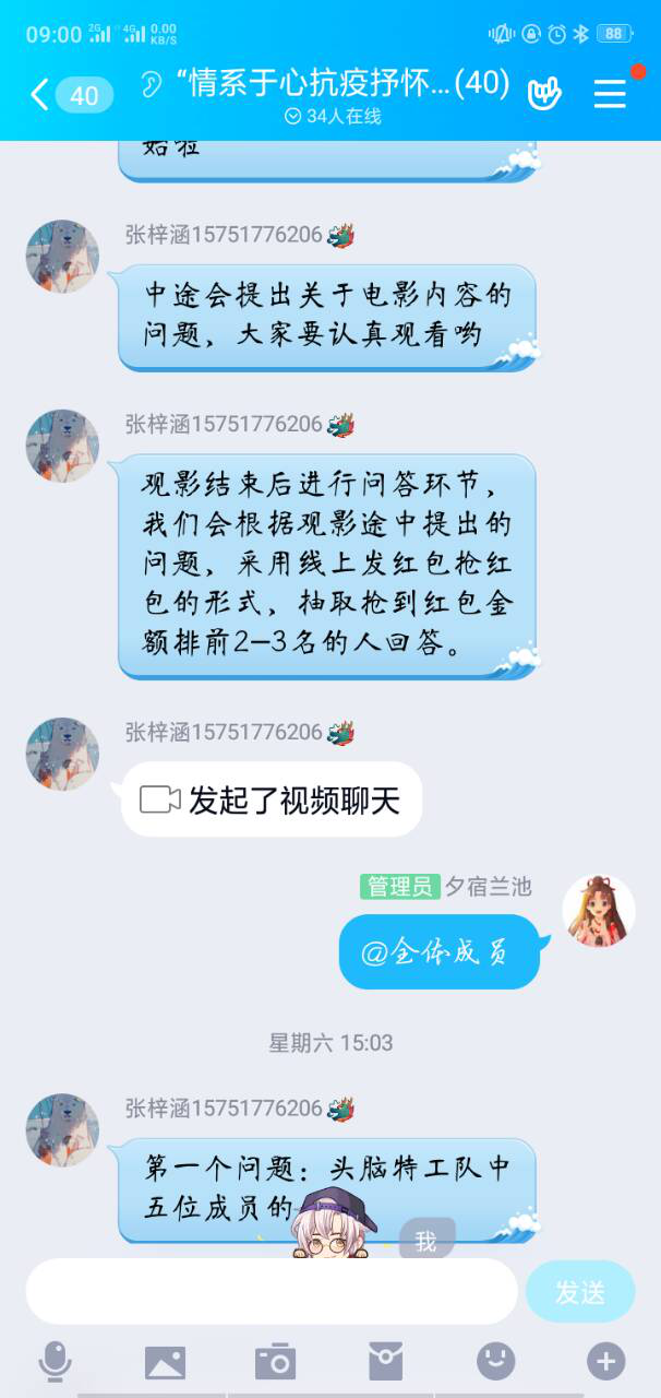 观影结束后,进行问答环节,工作人员根据观影途中提出的问题,采用活动QQ群内发红包抢红包的形式,抽取抢到红包金额排前2-3名的人进行回答。