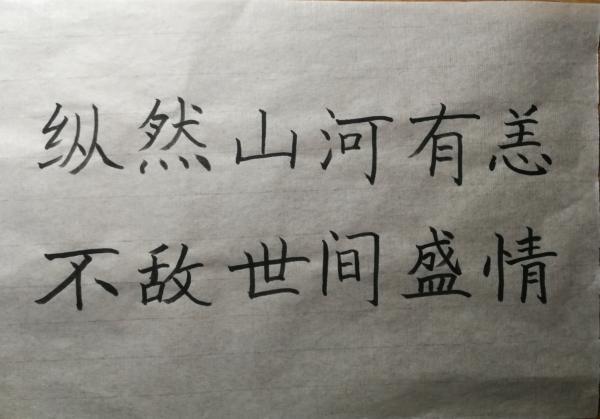 在书法比赛中,我们还欣赏到“纵然山河有恙 不低世间盛情”十二个方块字看似朴实无华,实则兼纳乾坤,书法里融入了儒家的坚毅,果敢和进取,也蕴涵了老庄的虚淡,散远和沉静闲适,还往往以一种不求丰富变化,在运笔中省去尘世浮华以求空远真味的意味。