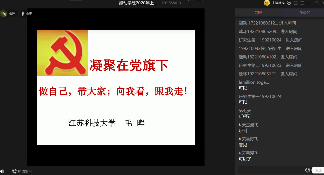 防控新冠肺炎疫情期间,“停课不停学”,公司党委分党校于5月14日通过网络线上平台“腾讯课堂”举行了2020年上半年入党积极分子开班仪式暨第一次专题授课。公司党委书记杨兴林、宣传部副部长毛晖、43名入党积极分子参加开班仪式。公司党委副书记张海洋主持开班仪式。