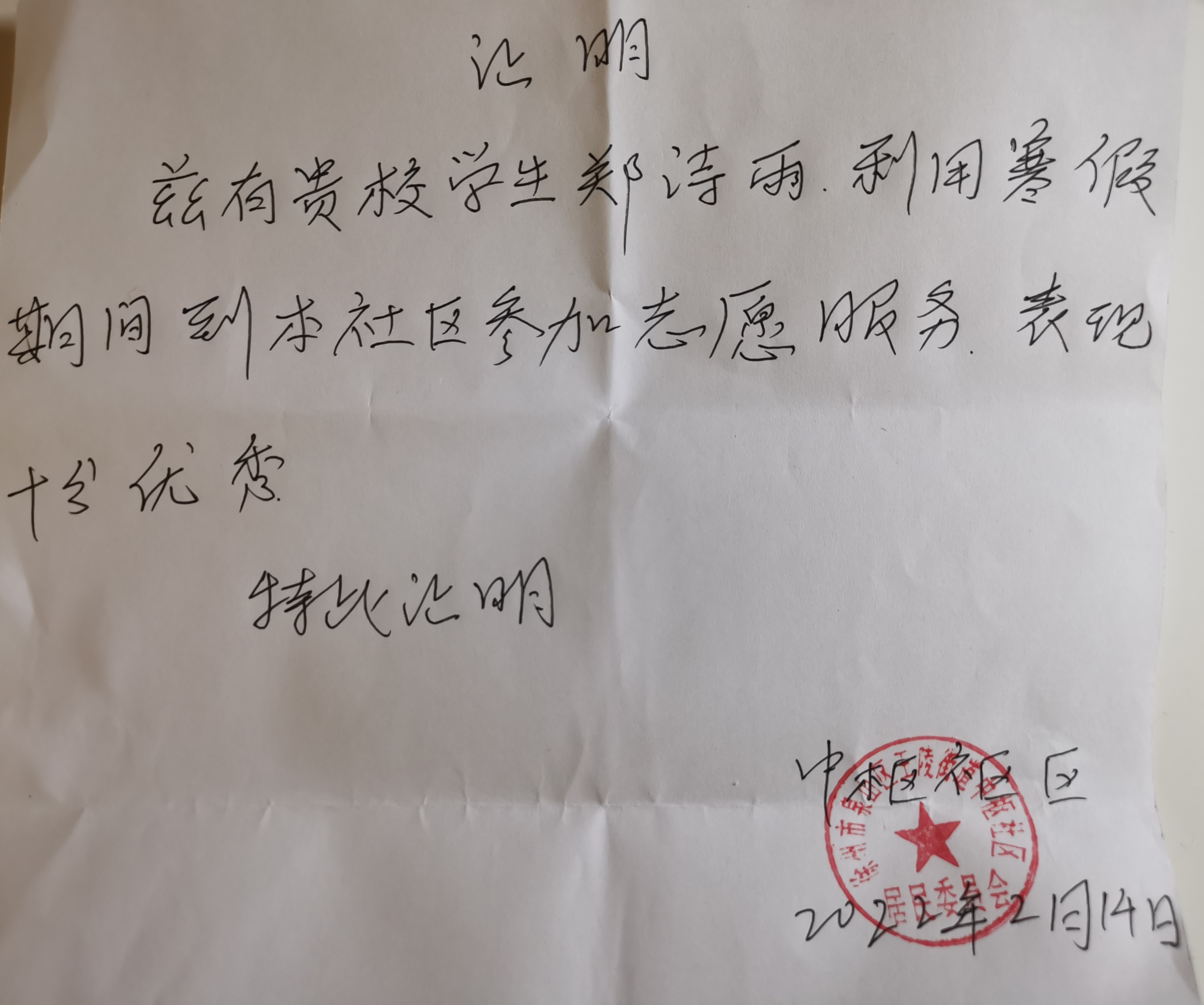 公司研三王志孟同学寒假在家乡进行了志愿服务,主要负责引导车辆接受检查,登记外来驾驶员及车辆的基本信息,提醒返乡人员及时到村委会进行报备登记;同时他还在村委会办公,帮助空巢老人申请核酸采样申报信息。作为一名员工党员,研一的郑诗雨同学寒假期间也在家乡社区展开了社区志愿服务。在志愿服务期间,郑诗雨主要负责社区人员日常进出登记、体温测量、疫情信息收集、防疫知识宣传,充分发挥了一名共产党员的模范带头作用。