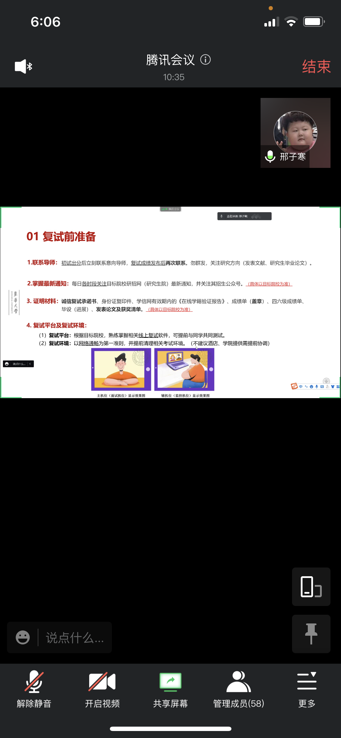 各位学长学姐结合自身的复试经历从复试专业知识准备、中英文自我介绍打磨、面试回答技巧、礼仪及注意事项等方面对即将复试的各位学弟学妹们进行了经验分享。