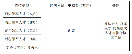 补充说明:首聘期内(进校前三年,下同)获批更高等级人才项目的领军人才和获批省部级及以上人才项目并达到领军人才级别的学科(学术)带头人,可兑现购房补贴、安家费差额。