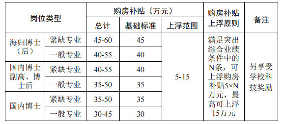 补充说明:首聘期内获批省部级及以上人才项目,达到领军人才级别的海内外博士,可兑现购房补贴差额。