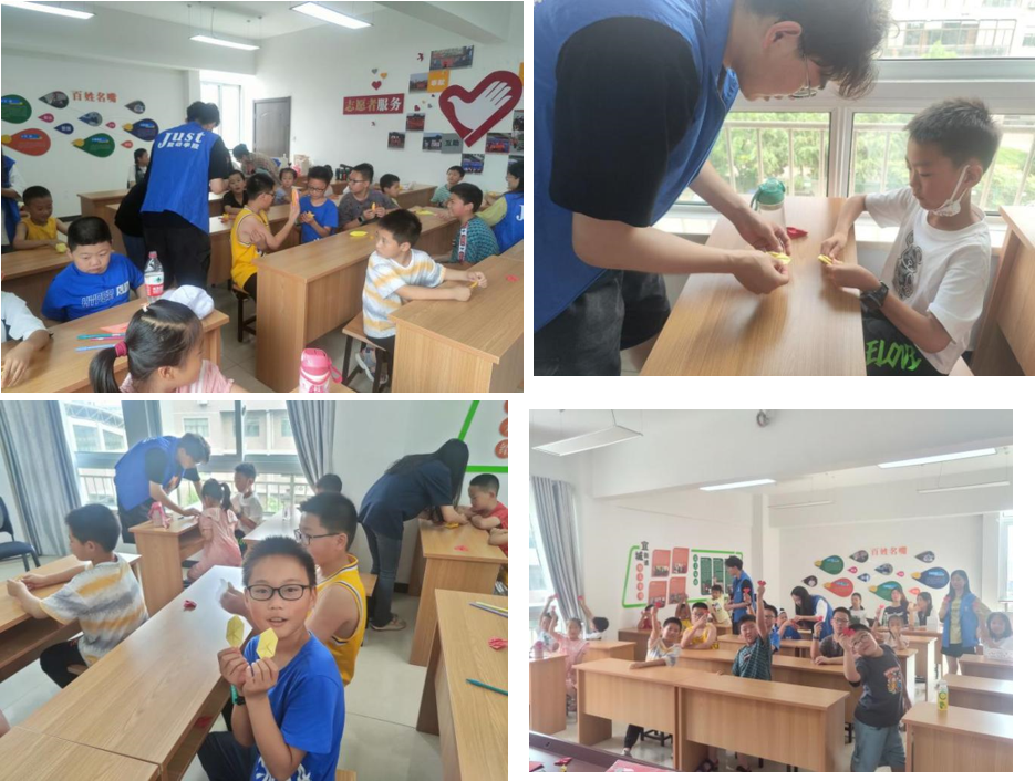 7月3日上午,志愿者与社区孩子们开展了手工折纸活动。通过利用孩子们平时搁置在家不用的卡纸或彩纸来完成折纸,以启示孩子们将身边的废纸变废为宝,达到节能环保的教育目的。孩子们在志愿者的指导与帮助下,将这些二次利用的废纸折叠出了“小爱心”与“皮卡丘”的形状。虽然制作过程存在一定的困难,但孩子们与志愿者通力合作,共克困难,最终使孩子们开心地高举着他们的制作成果。